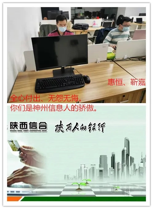 在这次防疫大考中,陕西信合项目组的两名同事惠恒、靳嘉也主动请缨,从12月22号开始,两位同事一直坚守在一线岗位,他们克服生活条件上的不便,舍小家,为大家。当问到他们在现场的生活有什么困难时,他们说到:“没困难,什么都不缺,家里也都安顿好了。”当提醒他们在现场注意安全,做好防疫措施的时候,他们说到:“在艰难时刻,我们愿意为公司赢得荣誉,这都是我们应该做的。”